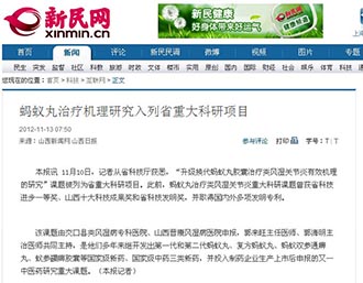 本报讯 11月10日,记者从省科技厅获悉,“升级换代蚂蚁丸胶囊治疗类风湿关节炎有效机理的研究”课题被列为省重大科研项目。此前,蚂蚁丸治疗类风湿关节炎重大科研课题曾获省科技进步一等奖、山西十大科技成果奖和省科技发明奖,并取得国内外多项发明专利。