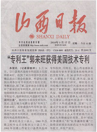 本报讯 (记者薛锁明)5月14日,山西省交口县类风湿病专科医院主任医师郭来旺,收到了来自中国中医药保健品进出口商会的邀请,希望他应邀到台湾参加有关中医药方面的交流、考察活动。据了解,这家商会主要是看中了郭来旺的专利技术。因为前不久,他刚刚收到从美国华盛顿寄来的发明专利证书,他研制的抗风湿新药“蚁参蠲痹胶囊”,被授权为美国发明专利。至此,这位被当地群众誉为“专利王”的郭来旺,共申请国内外专利21项,其中已授权10项,发明专利7项,获得国外技术专利两项,有两项国家发明专利成果得到转化。