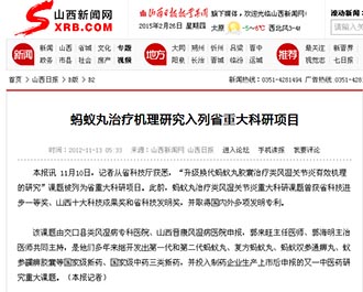 本报讯 11月10日,记者从省科技厅获悉,“升级换代蚂蚁丸胶囊治疗类风湿关节炎有效机理的研究”课题被列为省重大科研项目。此前,蚂蚁丸治疗类风湿关节炎重大科研课题曾获省科技进步一等奖、山西十大科技成果奖和省科技发明奖,并取得国内外多项发明专利。