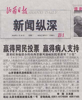 1月8日下午,山西省交口县类风湿病专科医院院长郭来旺(旺龙蚂蚁丸发明人)和他创办的山西晋康风湿病医院,在山西省首届医疗行业“百优”、“十佳”网络评选活动颁奖典礼大会上,分别荣获“民营医院医生十佳”、“民营医院十佳”光荣称号,成为全省民营医院和民营医院医生学习的榜样之一,也是全省风湿病医院行业中唯一获此殊荣者。
